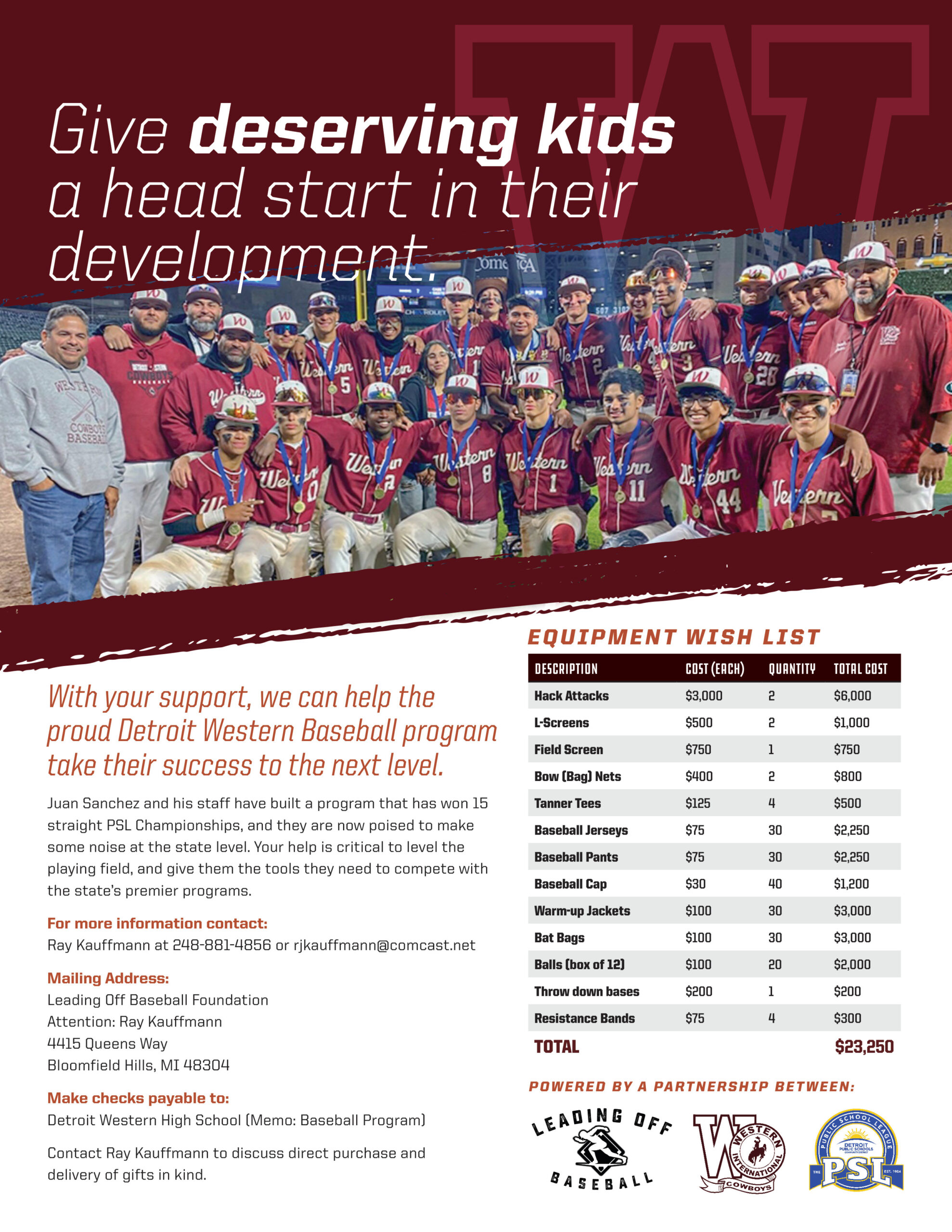 In November 2023, the Leading Off Foundation connected with Juan Sanchez, coach of Detroit Western baseball. Coach Sanchez and his incredible staff have built a program that has won 15 straight PSL Championships, and they are now poised to make some noise at the state level.